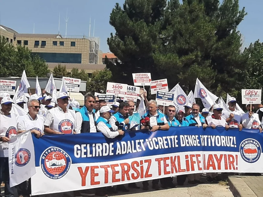 Diyanet-Sen Genel Başkanı Ali Yıldız, teşkilat üyeleriyle birlikte Hazine ve Maliye Bakanlığı önünde basın açıklaması yaparak 8. Dönem Toplu Sözleşme görüşmelerinde kamu işvereninin sunduğu maaş zam teklifini protesto etti. Yıldız, 2026 için %10 + %6, 2027 için %4 + %4 zam öngören teklifin “haksız, hakkaniyetsiz ve ciddiyetsiz” olduğunu söyledi.