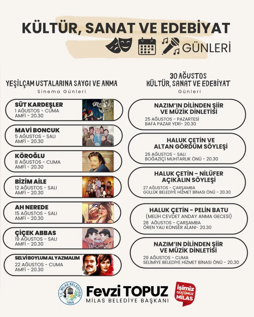 Milas Belediyesi, Ağustos ayı boyunca ilçede kültür ve sanatın çeşitli alanlarına odaklanan Kültür, Sanat ve Edebiyat Günleri düzenliyor. Etkinliklerde Yeşilçam filmleri, söyleşiler, edebi anma geceleri, şiir ve müzik dinletileri yer alacak.